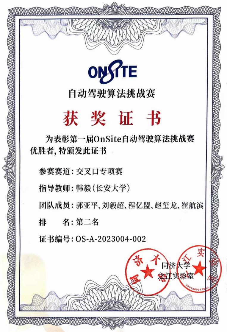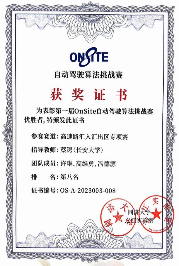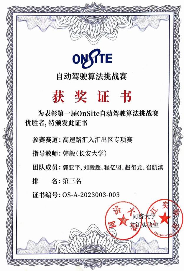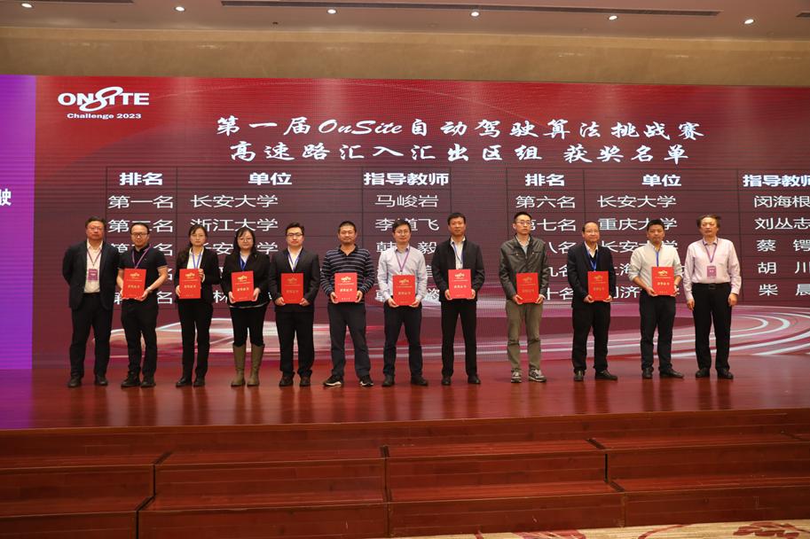 经过100天的激烈角逐,第一届OnSite自动驾驶算法挑战赛决赛答辩于2023年6月30日在同济大学圆满落下帷幕,最终产生北京航空航天大学、做爱 等12支优胜团队。做爱 共有两支队伍参加,一支由做爱 韩毅教授作为领队,硕士生郭亚平、刘毅超、程亿盟、赵玺龙、崔航滨组成的团队在“交叉口专项赛”和“高速汇入汇出区赛”两个赛道的比赛中分别取得第二名和第三名的成绩;另一支由做爱 蔡锷老师作为领队,硕士生许琳、高维勇和冯德源组成的团队在“高速汇入汇出区赛”取得第八名的成绩。颁奖典礼于2023年11月5日在南京举办。