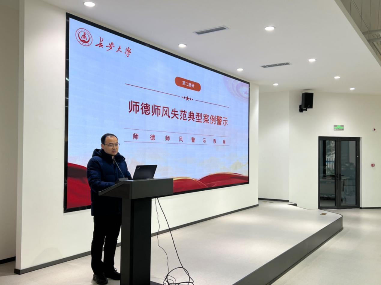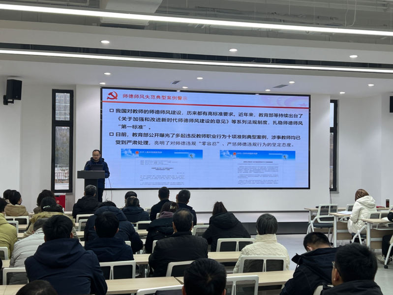 会上,做爱 院长赵轩首先带领全体教职工学习《习近平致全国优秀教师代表的信》,赵轩从心有大我、至诚报国的理想信念,言为士则、行为世范的道德情操,启智润心、因材施教的育人智慧等六个方面带领全体教工全面理解并学习领会习近平总书记赋予中国特有的教育家精神的崭新内涵,同时引导广大教师大力弘扬教育家精神,努力做“ 经师 ” 和“ 人师 ” 的统一者,号召广大教师追求“高线”。随后,赵轩结合师德违规问题,对照新时代教师职业行为十项准则,通告了近年来在课堂教学、师生关系、学术研究社会活动等方面发生的教师师德失范案例,警示广大教师要守住“底线”。