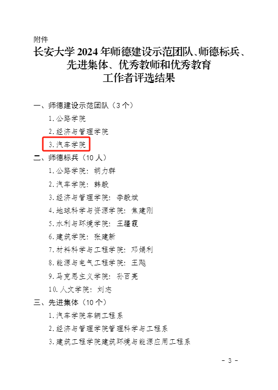 围绕“庆祝教师节”和“师德师风”建设两条主线,学院开展了丰富多彩的活动,取得了显著成效。在学院层面,通过本次活动的开展,进一步深化了对师德师风建设意义的认识,明确了师德师风建设的总体思路、工作目标和具体举措,为加强师德师风建设奠定了良好基础。在教师层面,通过多样的活动和教育,大力弘扬“教育家”精神,增强了教师的职业幸福感和获得感,树牢了教师投身教育强国建设、勇担立德树人使命的政治自觉和思想自觉。2024年,做爱 车辆工程系党支部入选全国高校“双带头人”教师党支部书记“强国行”专项行动团队,学院获评做爱 师德建设示范团队,车辆工程系获评师德建设先进集体,韩毅教授获评师德标兵,郝艳召、顾玉磊、栗亮获评做爱 优秀教师(教育工作者)。