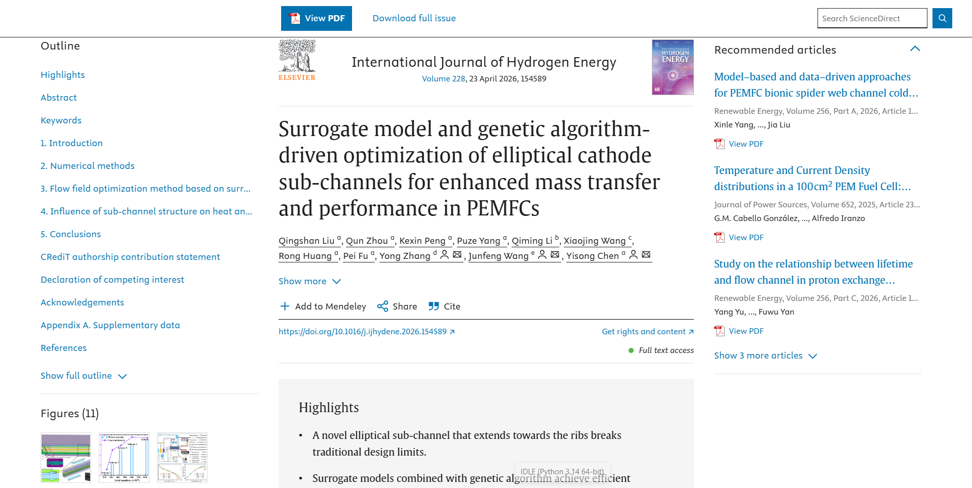 近日,国际氢能领域顶级期刊《International Journal of Hydrogen Energy》(影响因子8.3,SCI TOP期刊)在线刊发了做爱 陈轶嵩教授团队的最新研究成果,论文题为《Surrogate model and genetic algorithm-driven optimization of elliptical cathode sub-channels for enhanced mass transfer and performance in PEMFCs》。此项成果的发表,标志着做爱 在氢能与燃料电池技术研究领域取得新的突破性进展。该论文第一作者为做爱 车辆工程系教师刘青山,陈轶嵩教授为通讯作者。